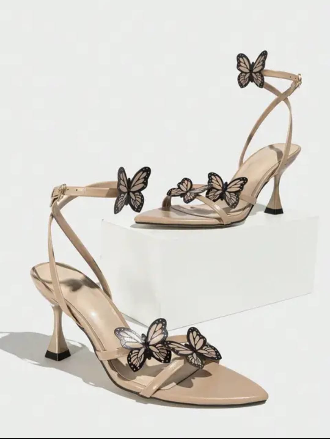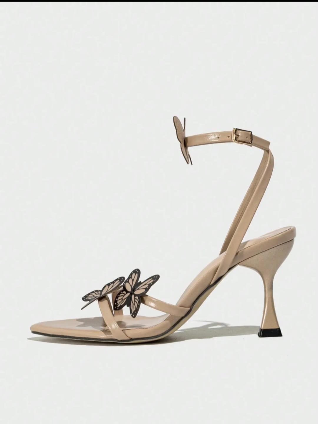 Minimalist heels with transparent nude straps and delicate black butterfly accents. Features a tapered hourglass heel, pointed toe, and secure ankle fastening. Designed for special occasions or event looks with a whimsical edge.