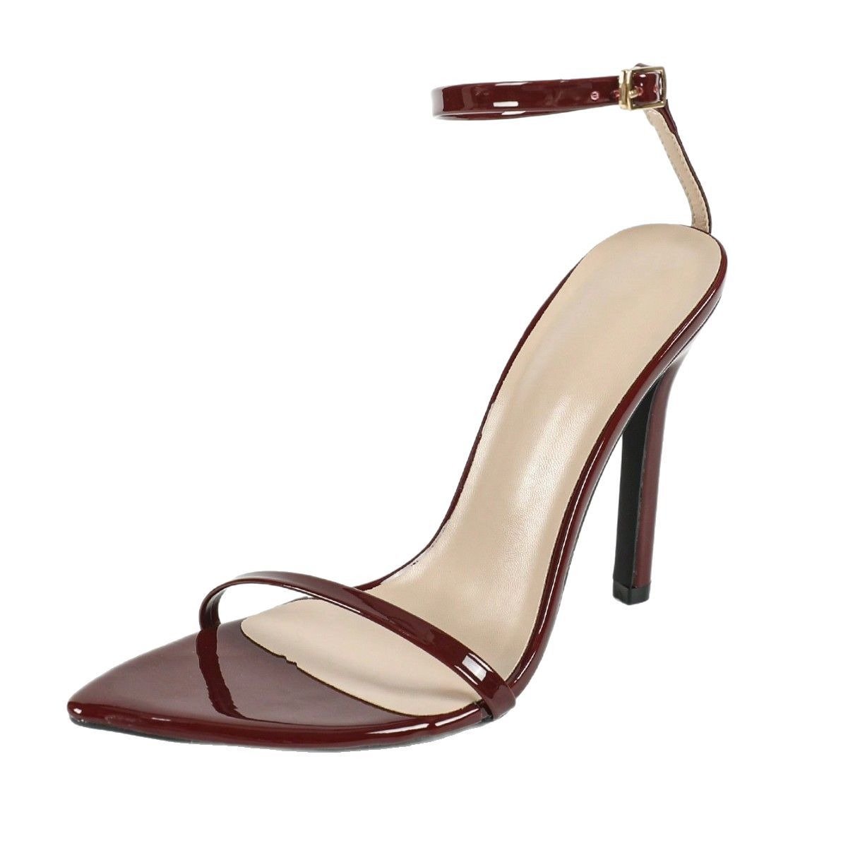 Burgundy patent stiletto with a single toe strap, slim ankle buckle and pointed toe.