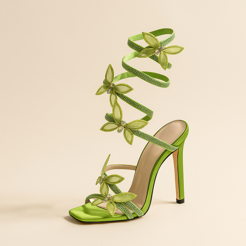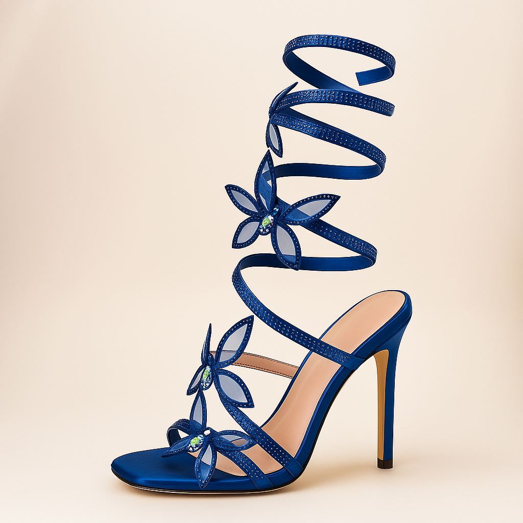 Satin gladiator-style stilettos with rhinestone-studded straps and cutout flower accents. Features a tall spiral wraparound design and stiletto heel. Best for event wear and evening looks.