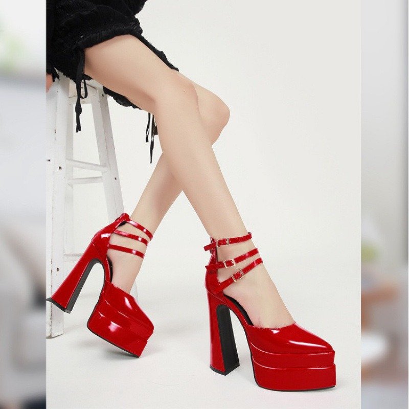 2024 Catwalk Buckle Thick Heel Pointed Hollow Patent Leather Sandals Super High Heel Waterproof Platform Sky-high Catwalk Heels