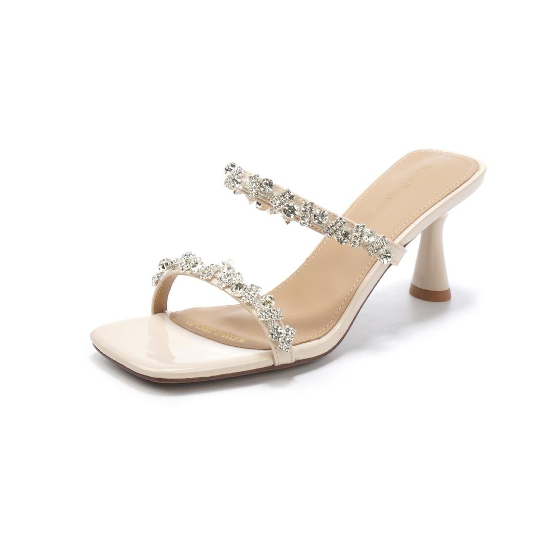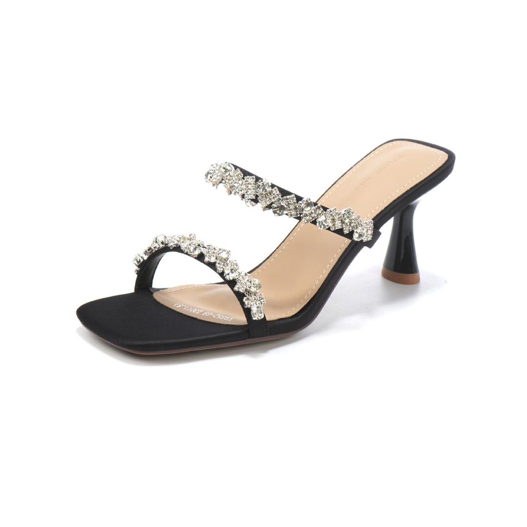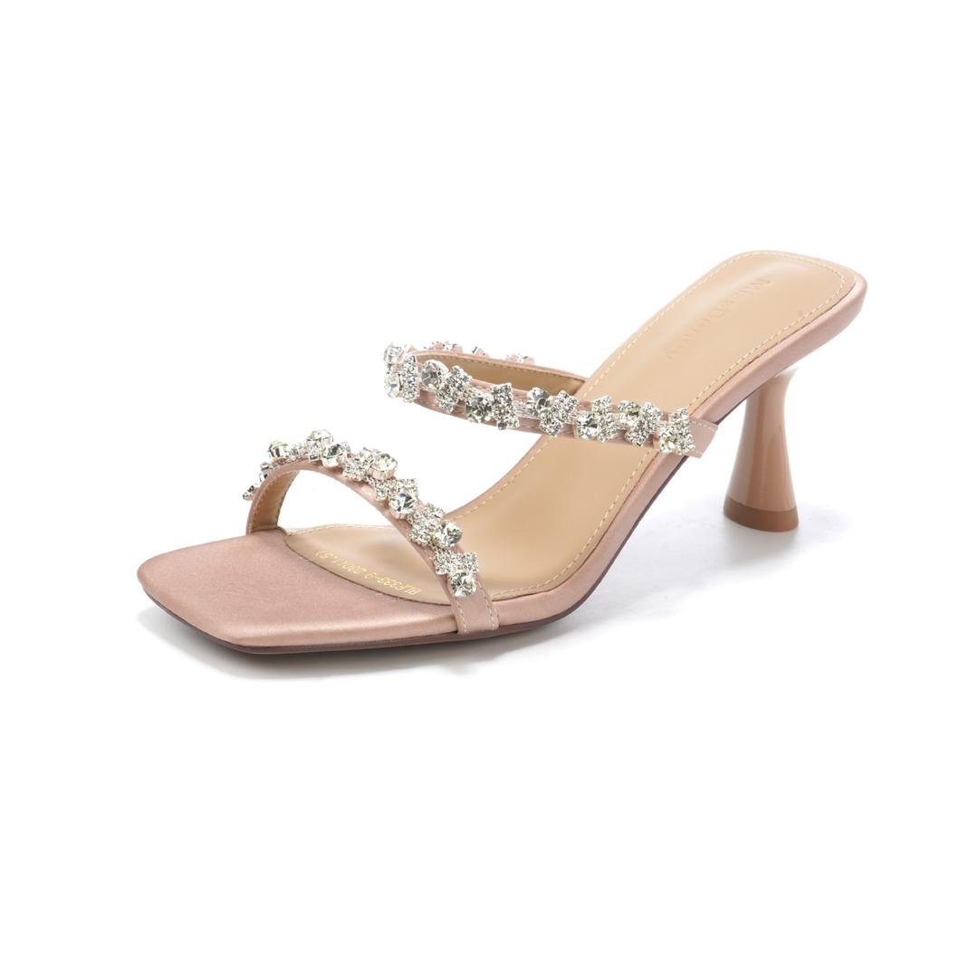 Minimalist slip-on kitten heels with double rhinestone straps. Delicate, feminine, and easy to style with dressy or casual outfits.