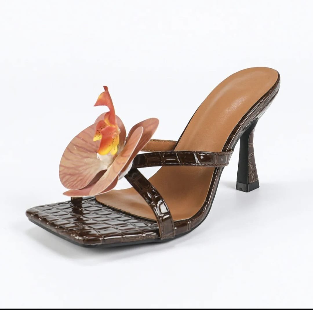 Open-toe heels with 3D floral appliqué and slim crossover straps. Features a square toe and medium stiletto heel. Designed for special occasions or standout styling