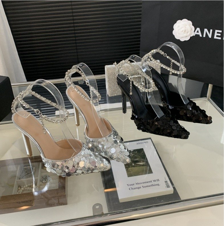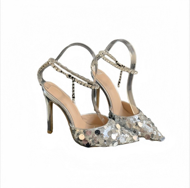 pointed-toe slingback heels combine a clear upper with metallic sequin detail. Chic, structured, and made for statement dressing.
