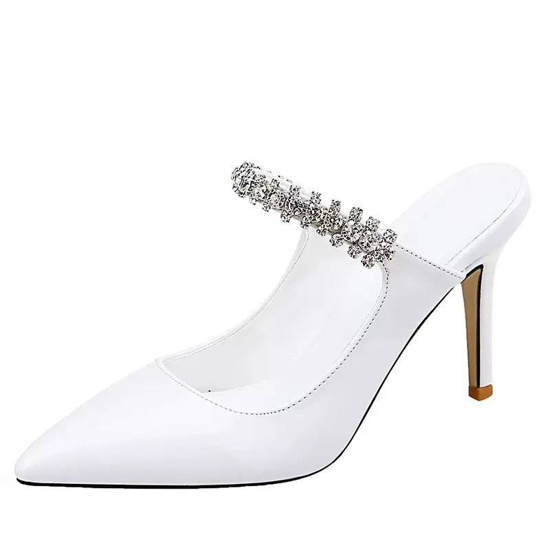 Glossy pointed-toe mules with a sleek stiletto heel and crystal-embellished strap. Made from patent faux leather for a polished finish. Easy slip-on design for day-to-night wear.