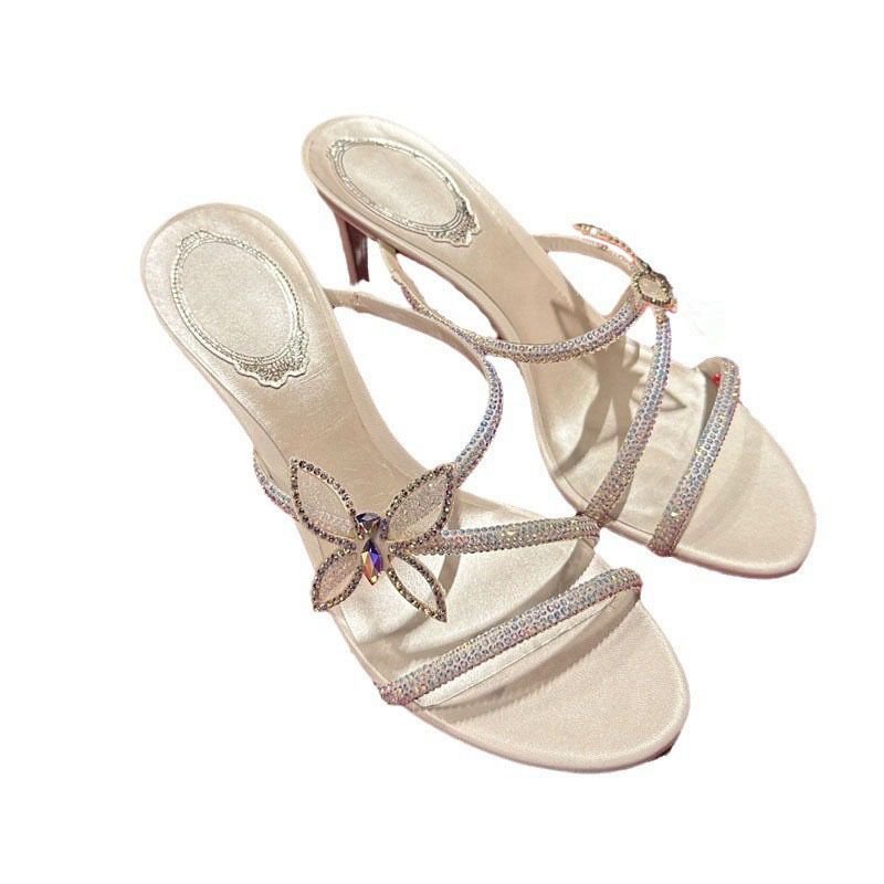 Minimalist kitten heels with crossover glitter straps and a rhinestone floral accent across the toes, perfect for understated glam
