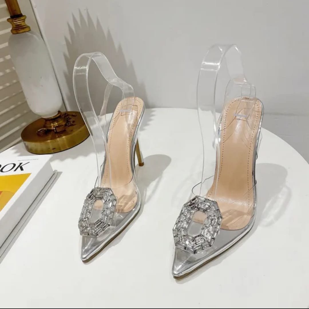 Sleek pointed-toe slingbacks in satin with a bold crystal-embellished buckle. Designed with a low stiletto heel and soft elastic strap—chic without the effort.