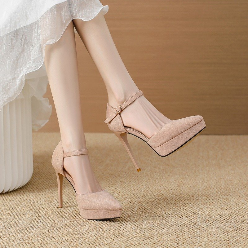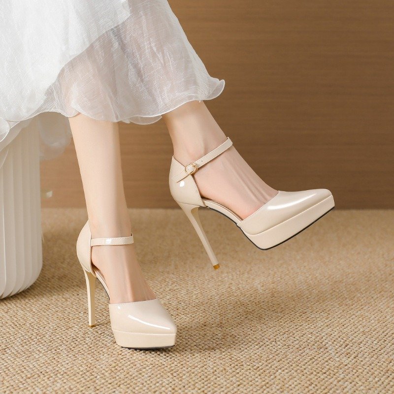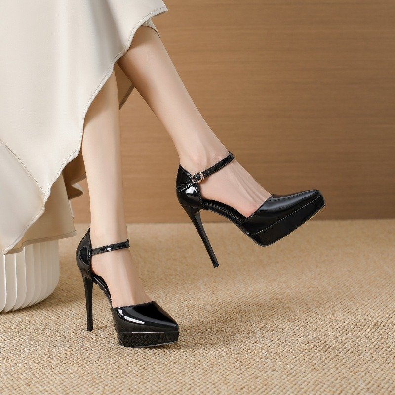 Patent finish with a thick platform and rounded toe. Features a thin ankle strap and tall stiletto heel.